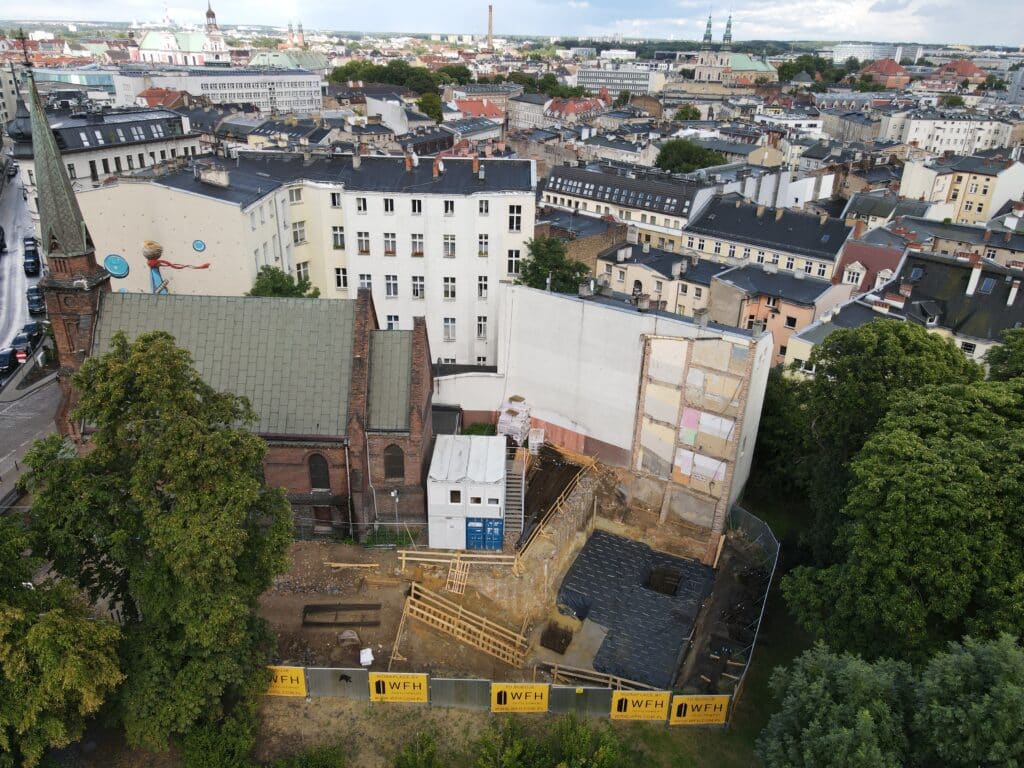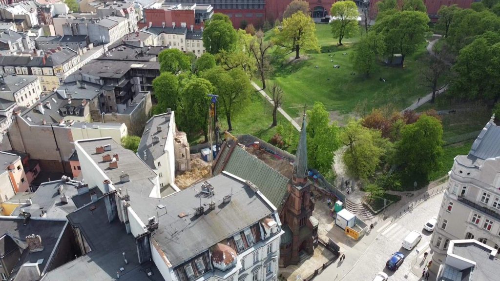 Prace budowlane postępują. Dziś krótki filmik z wiertnicą w tle prezentujący prace na odcinku części podziemnej. Właściwe wykonanie fundamentów wymagało od nas zabezpieczenia wykopu w formie ściany w technologii pali. Dzięki takiemu rozwiązaniu nie naruszamy struktury terenu przyległego, co było istotne ze względu na sąsiedztwo kościoła.